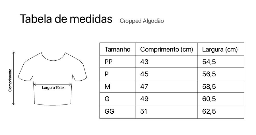 O Cropped Casual traduz modernidade e leveza em uma peça única. Produzido em Cotton (Algodão) Premium, oferece o conforto inigualável do algodão aliado à elasticidade do elastano para melhor caimento. Com toque suave e design versátil, é a escolha ideal para composições casuais que destacam atitude e sofisticação.